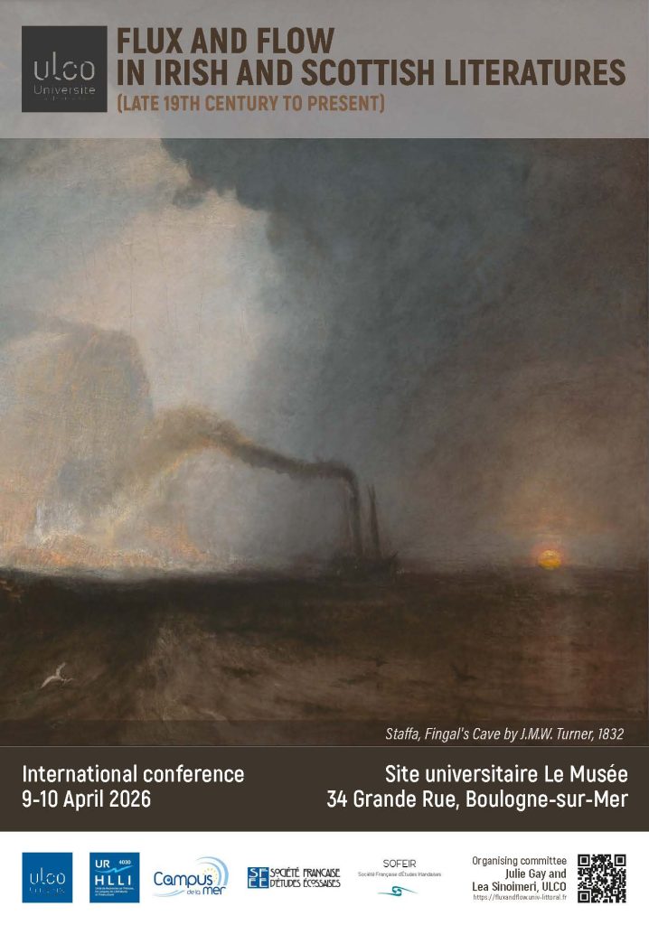 This conference seeks to explore the pervasive influence of the flux and flow of seas, oceans, rivers and other waterways on Irish and Scottish literatures from the late 19th century to the present. The rise of the “blue humanities” as part of what is often referred to as an “oceanic turn” in the humanities has turned critical attention towards the centrality of seas and oceans in the shaping and understanding of our real and fictional worlds. As Blum and Brannigan have argued, thinking from the vantage point of the sea invites an alternative epistemology that flows beyond landlocked and nation-bound frameworks, to embrace the connective, plural and interwoven currents of oceanic and riverine dynamics. Indeed, while initially blue humanities were mainly interested in oceans and seas, critics such as Steve Mentz have recently called for a more “inclusive” approach to the field, which would be open to multiple forms of water such as rivers, ice, vapor but also coastal spaces, islands and archipelagos, encouraging the development of a “poetics of planetary water”.