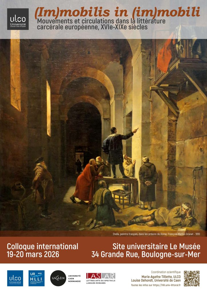 Colloque international « (Im)mobilis in (im)mobili : mouvements et circulations dans la littérature carcérale européenne (XVIe-XIXe siècles) », organisé par Marie-Agathe Tilliette et Louise Dehondt (LASLAR, Univ. Caen Normandie), les 19-20 mars 2026, amphi I, en hybride à Boulogne-sur-Mer