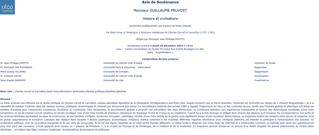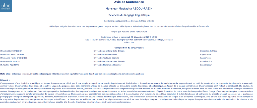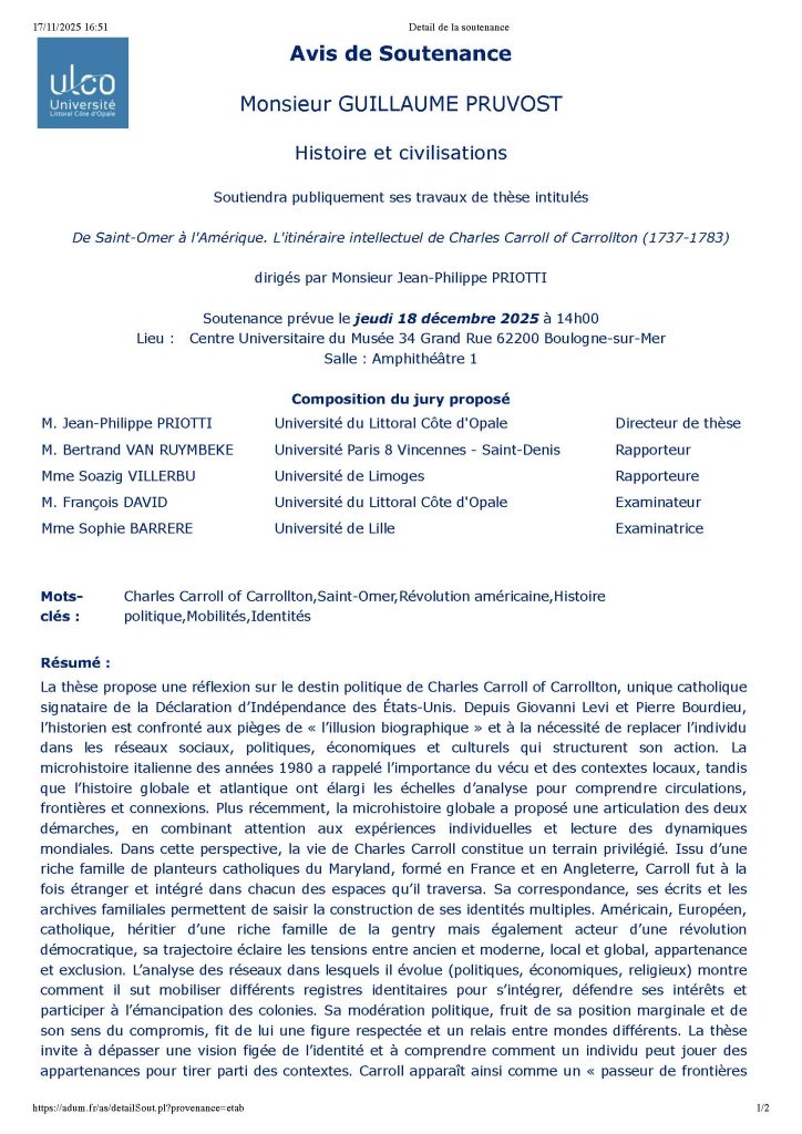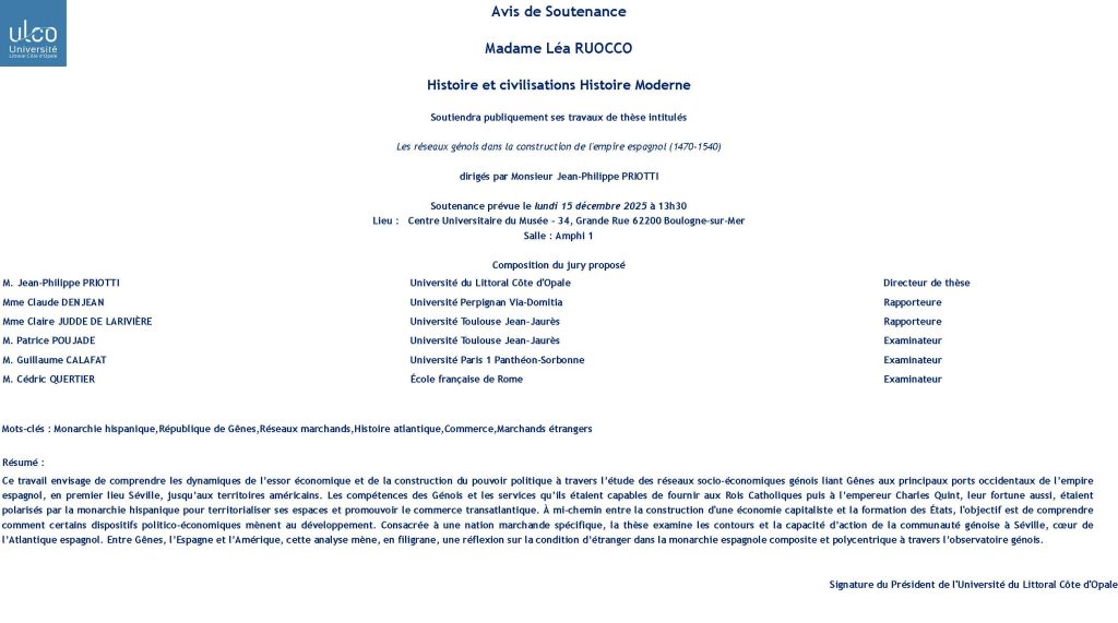 La soutenance sera également accessible en visioconférence pour celles et ceux qui ne pourraient se rendre à Aix-en-Provence. Contact pour le lien de visioconférence : florence.toucheron@univ-littoral.fr